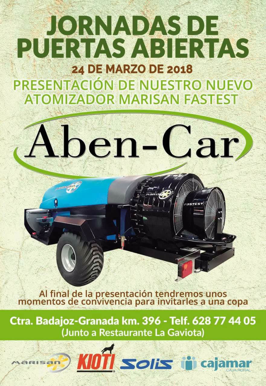 Estamos de enhorabuena, ya que este 24 de Marzo, Marisan presentará en La Jornada de puertas abiertas de AbenCar todos los mejores productos de Marisan y como novedad de este año en Fima 2018 de nuestro nuevo modelo Atomizador Fastest. Haremos pruebas de funcionamiento y os explicaremos todo lo que rodea a nuestros atomizadores, tanto del Fastest como de nuestros productos estrella, el Turboli y el Duplex Tornado.